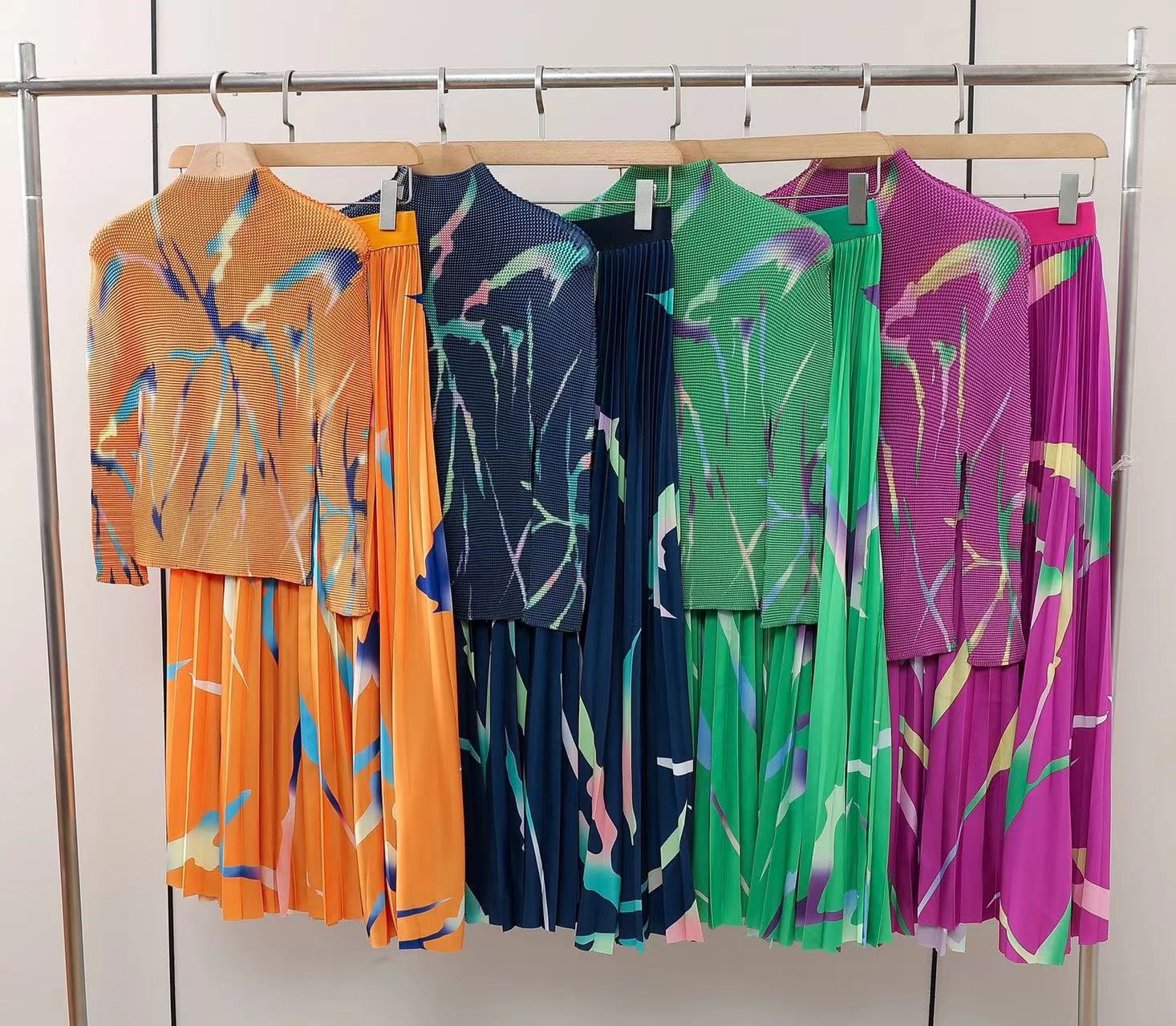 New Fashion Miyake Pleated Suit Women’s Summer New Fashion Printing Large Free Size Slim Top&Skirt 2 Pcs Set